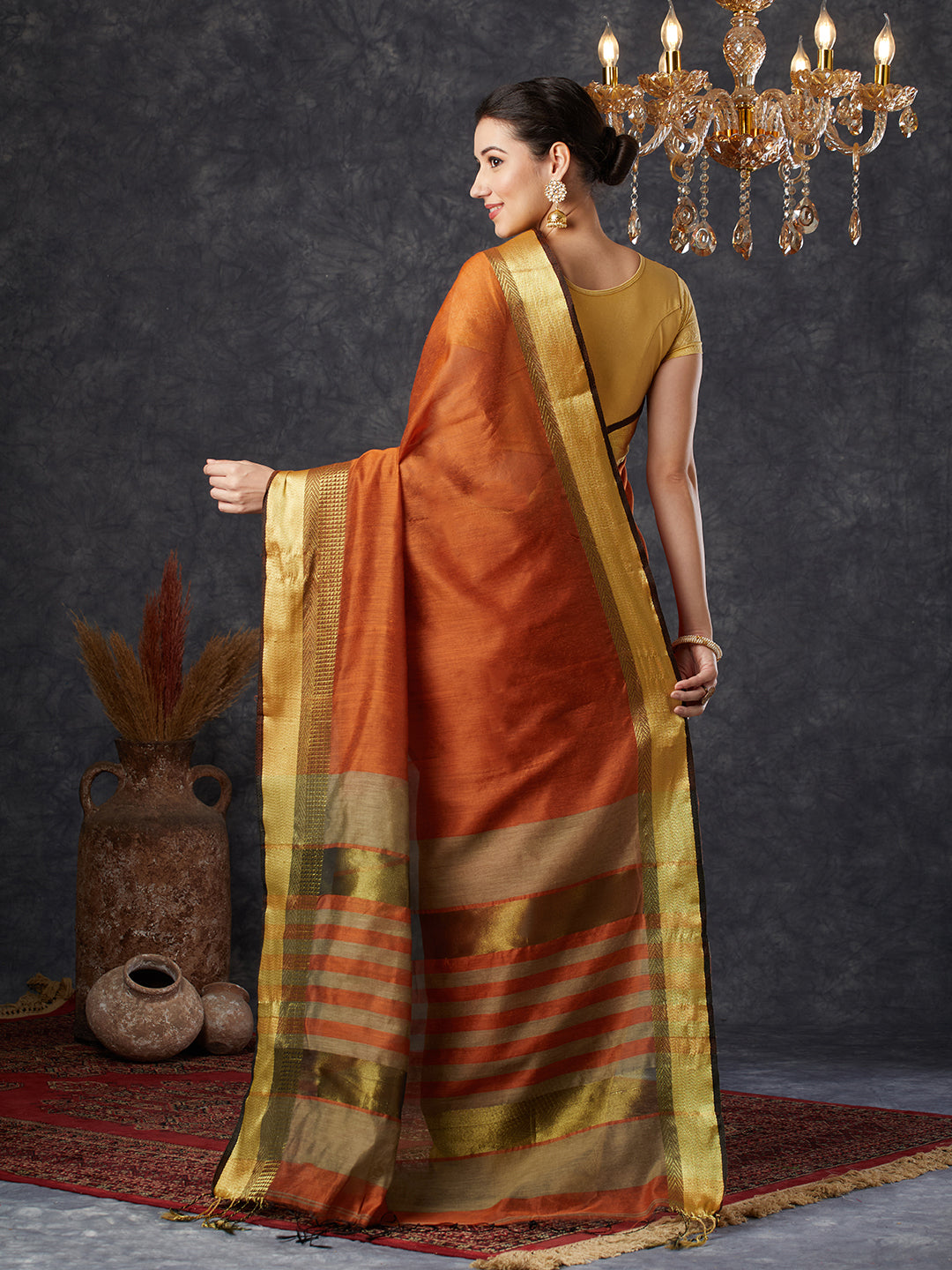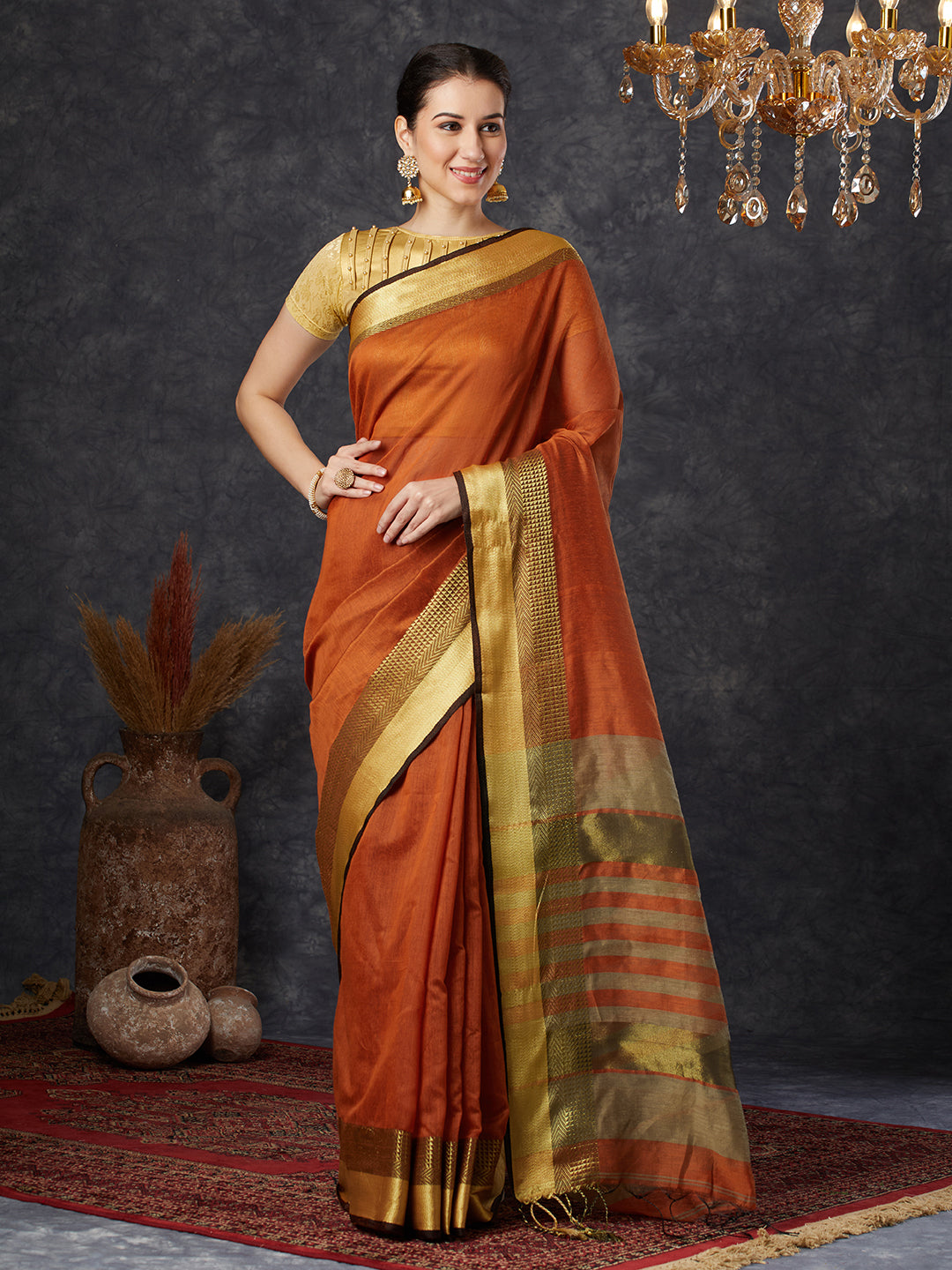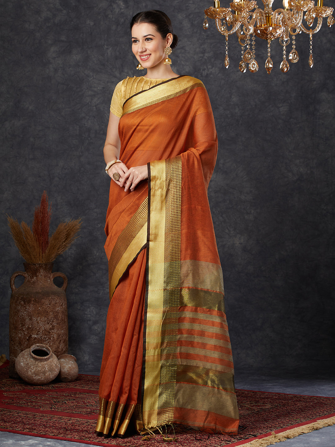 PAROKSH Women's Handloom Cotton Silk Orange Saree With Zari Border