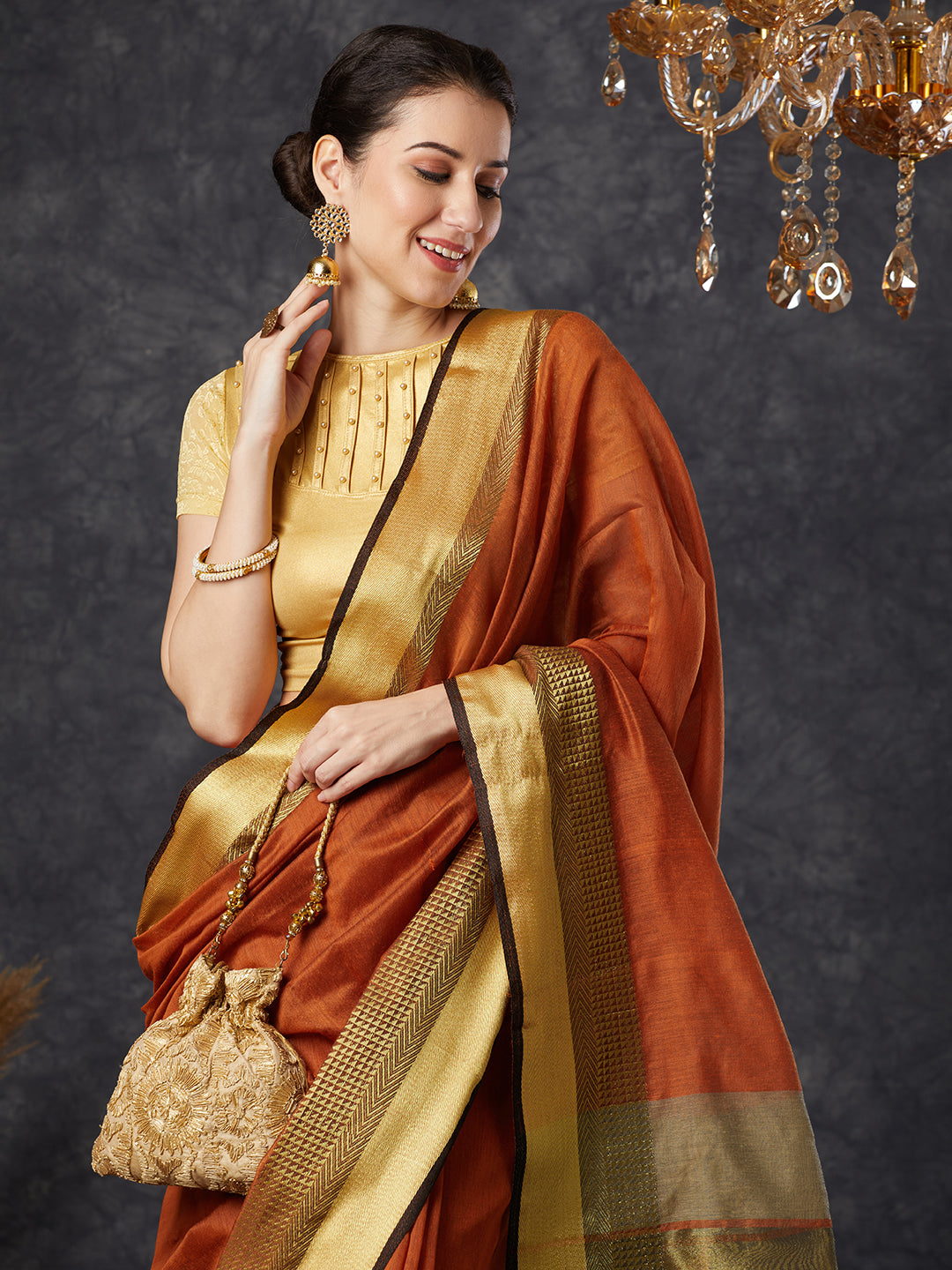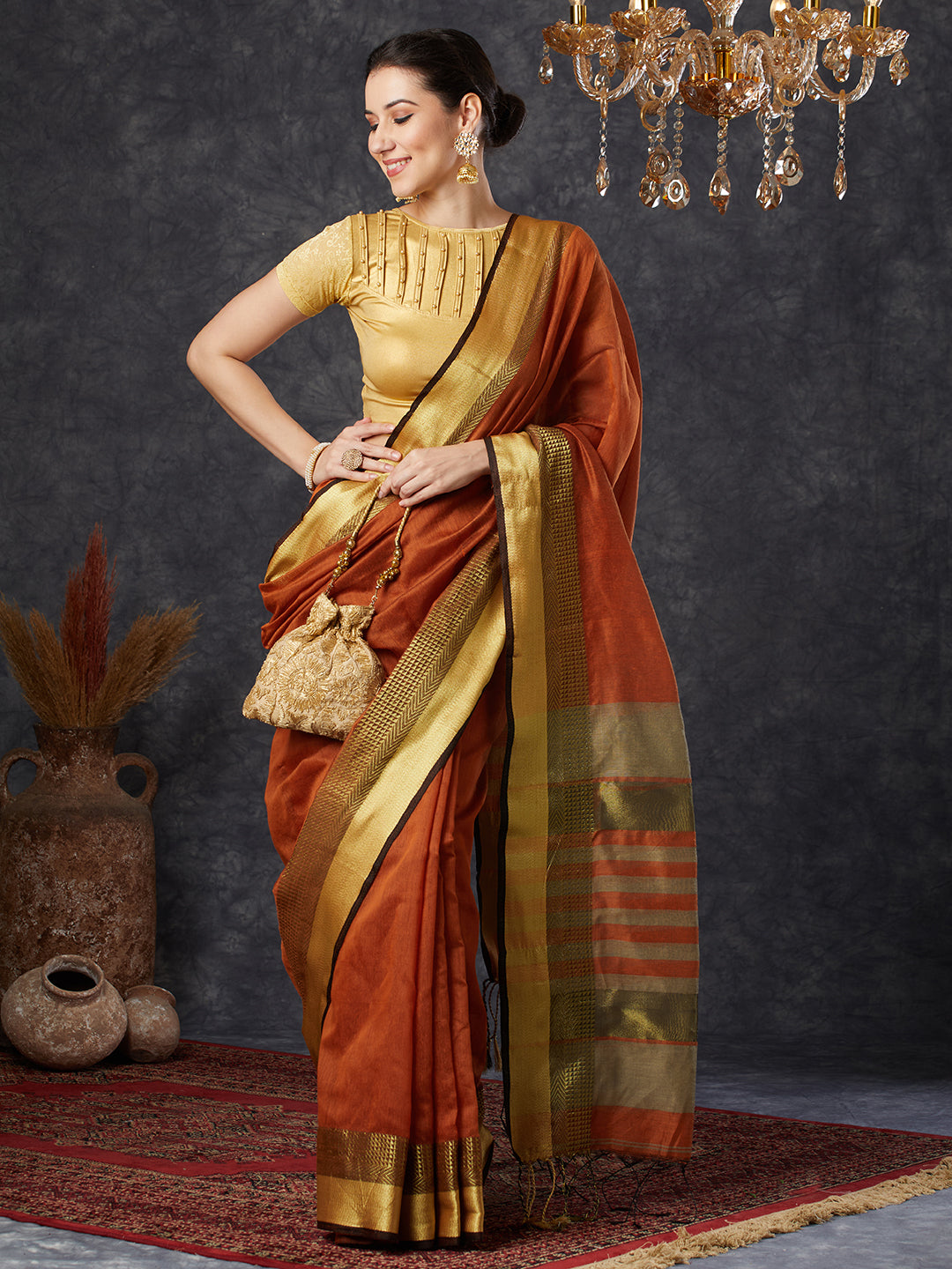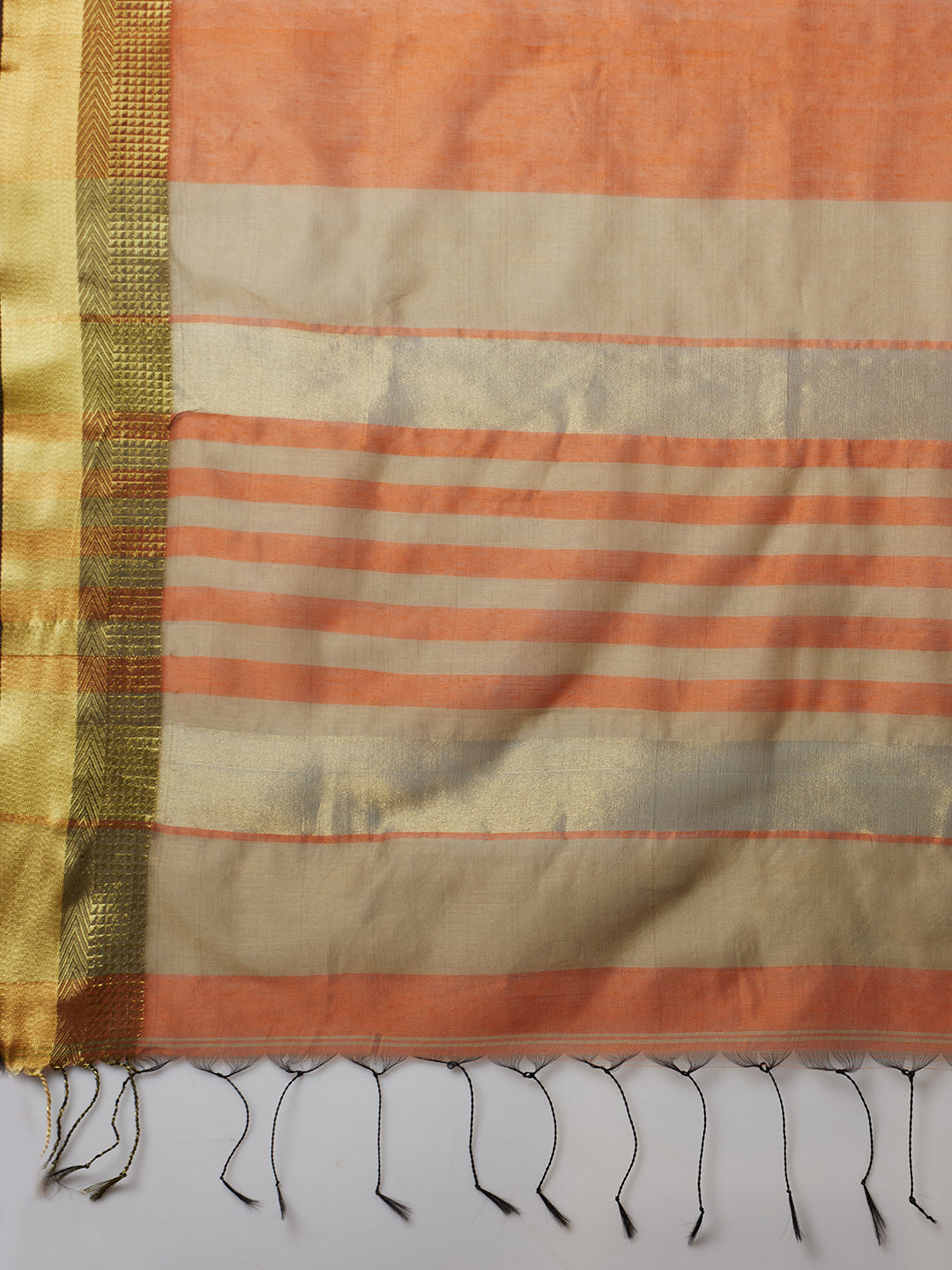 PAROKSH Women's Handloom Cotton Silk Orange Saree With Zari Border