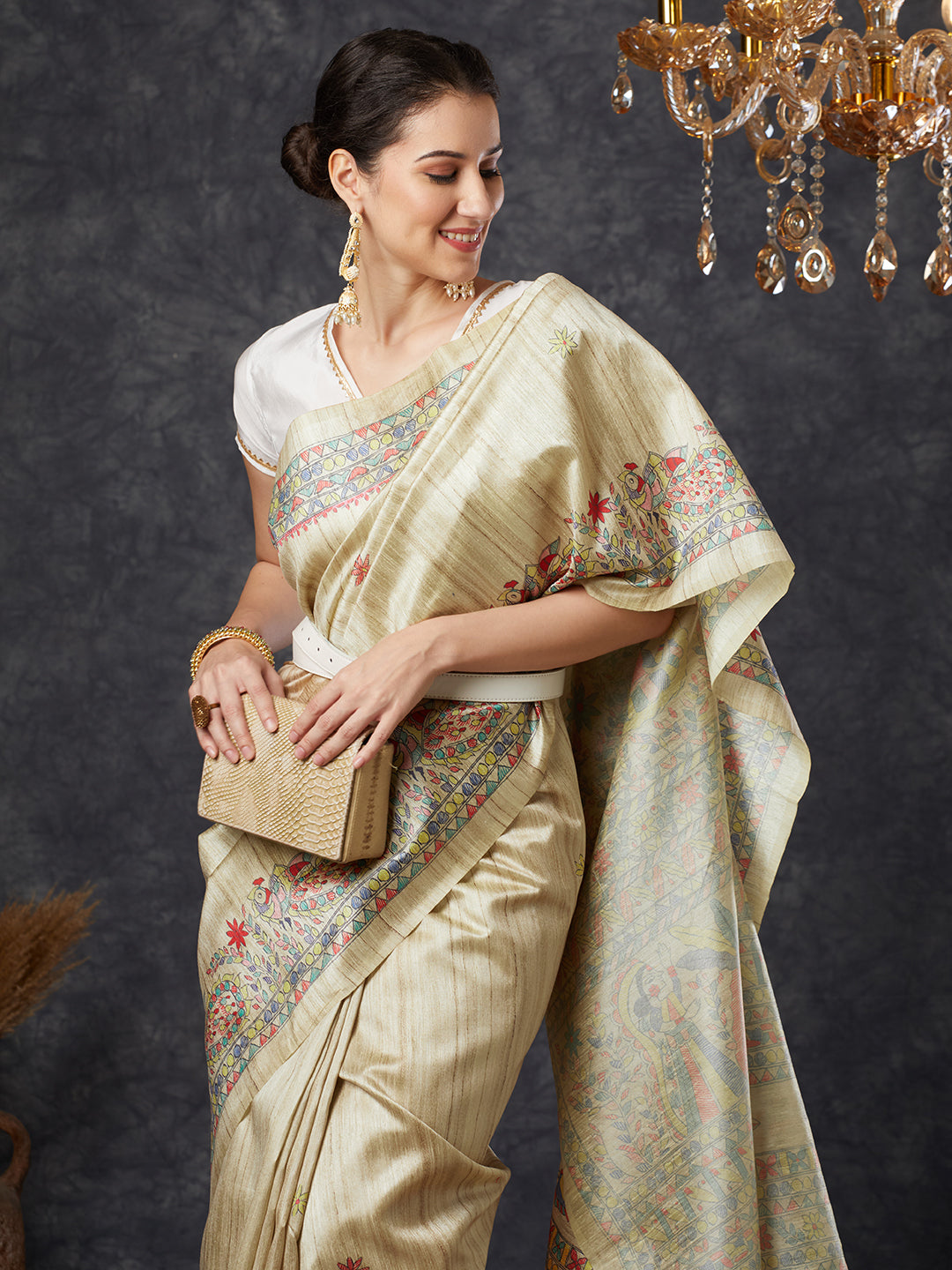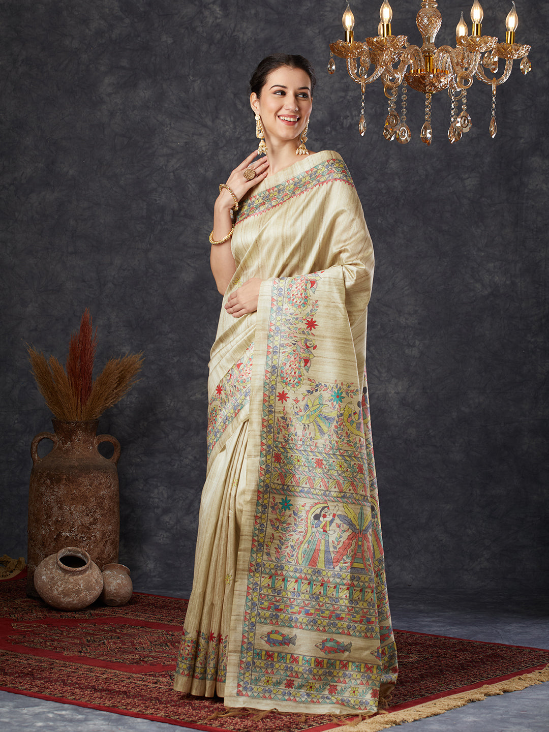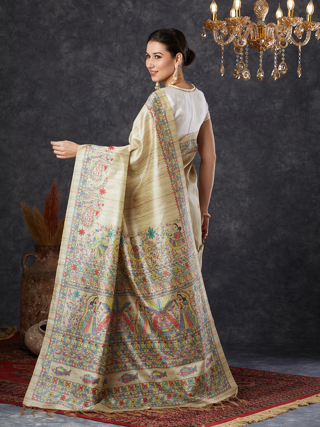 PAROKSH Women's Handloom Tussar Silk Madhubani Print Saree