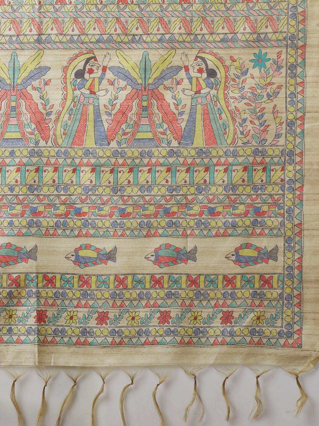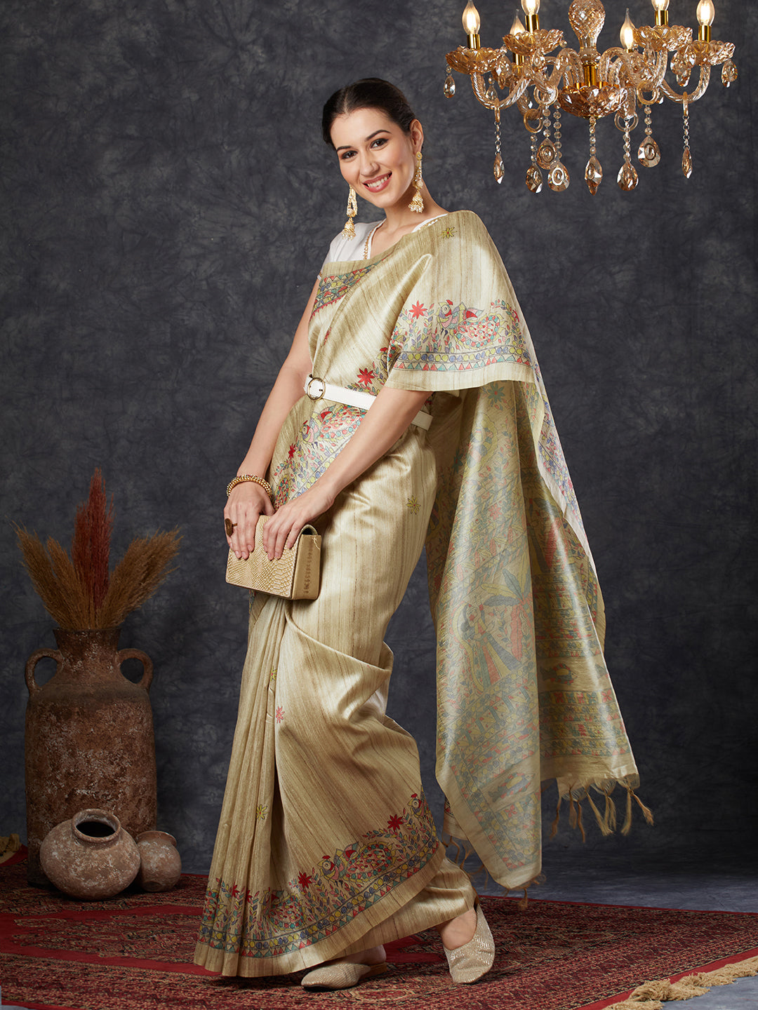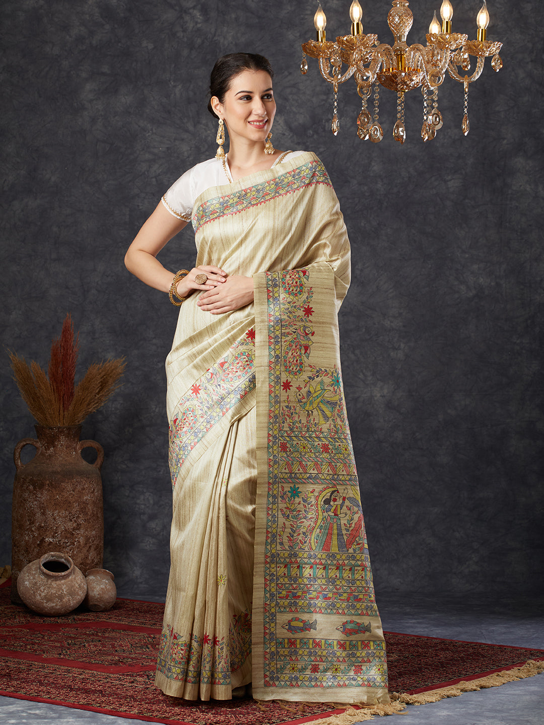 PAROKSH Women's Handloom Tussar Silk Madhubani Print Saree
