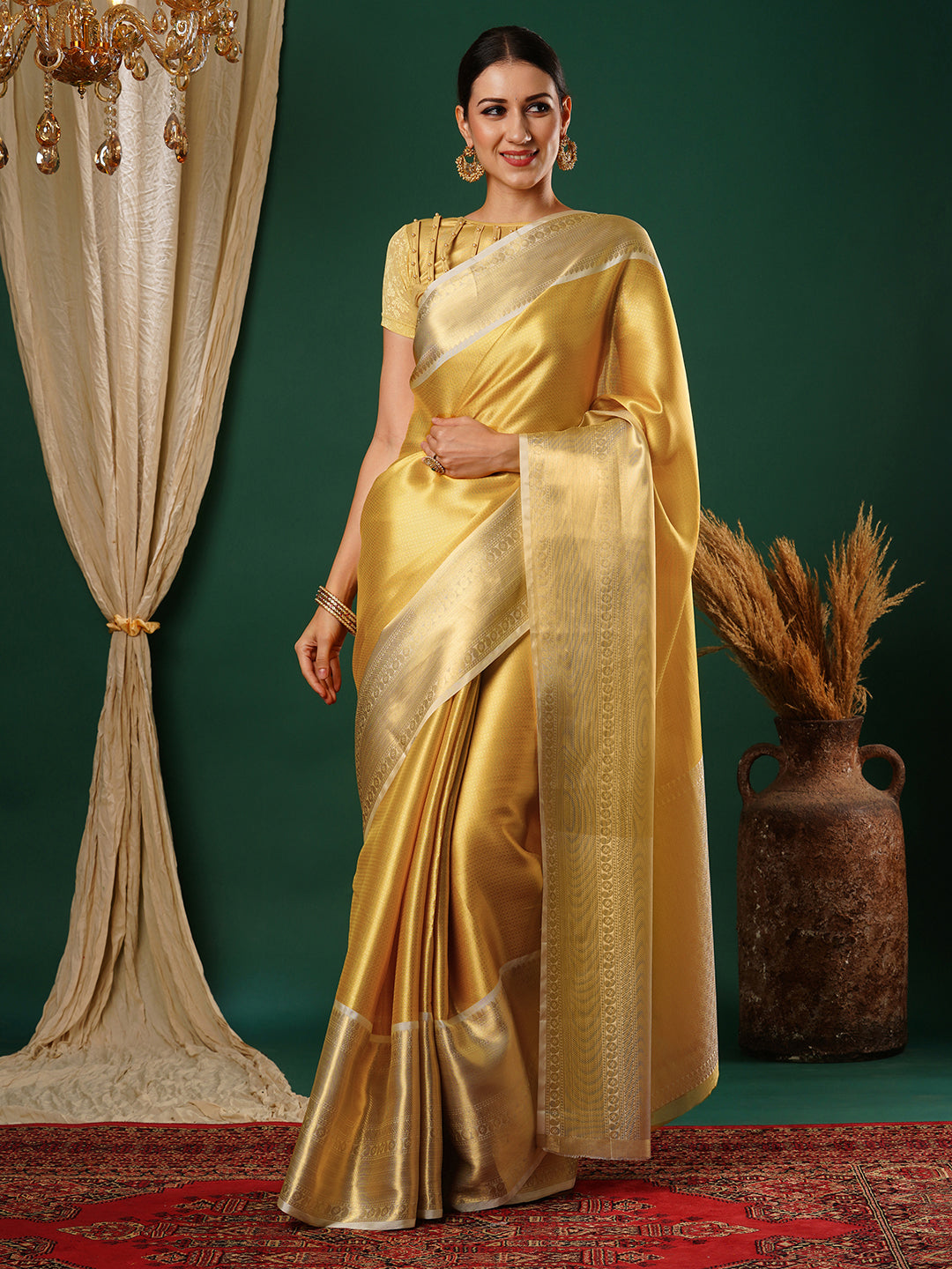 Women's Handloom Banarasi Solid gold saree with broad Zari Border